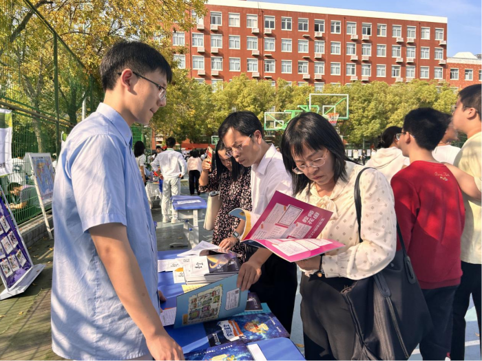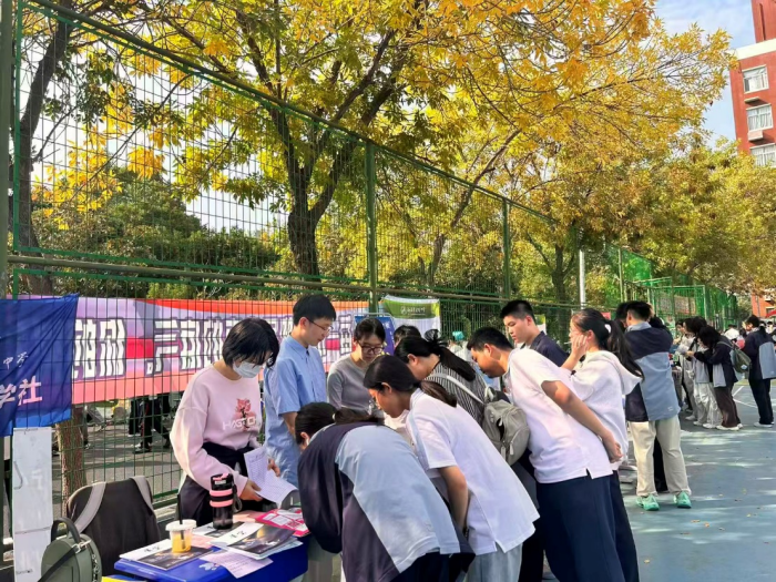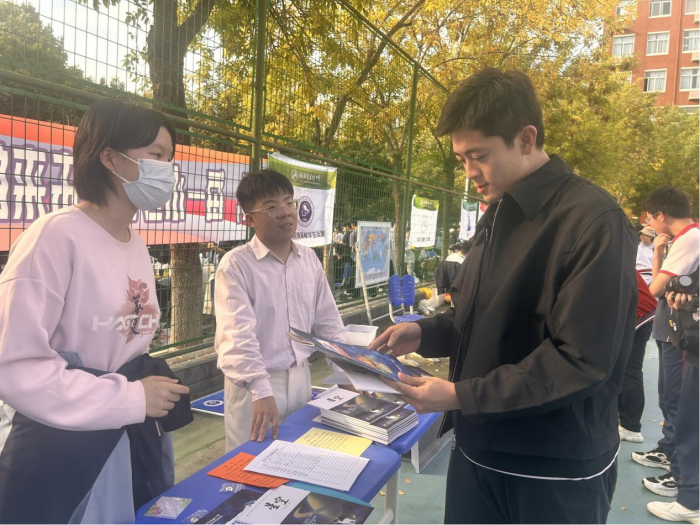往来之间,一位18届毕业学长来到现场,深情怀念母校社团生活,悉心询问社团发展。寄语学妹学弟通过文学社提升自己人文素养。临走时,带走星空杂志,赠与友人,怀念故情。如此可见,星空文学社魅力无限,前有“古人”,后引“来者”。和我们共建的外地学校老师特意来文学社纳新展台参观交流,他们在参观校园文化建设的途中,被活动现场浓郁的人文气息所吸引,欣然加入,对我们杂志赞不绝口。前任社长吕祥宇同学也亲临指导。已卸任的他,耐心地为前来咨询的新生们讲解文学社的部门构成、品牌活动以及他在这里的成长与收获。他与现任社团骨干并肩协作,从活动策划到人员安排,一一悉心点拨。“文学社的魅力在于‘共享’,”吕社长说,“我们共享对文字的热爱,共享创作的激情,也共享成长的迷茫与顿悟。我希望将这份‘以文会友’的纯粹精神传递下去,让星空成为每一个文学爱好者的精神家园。”