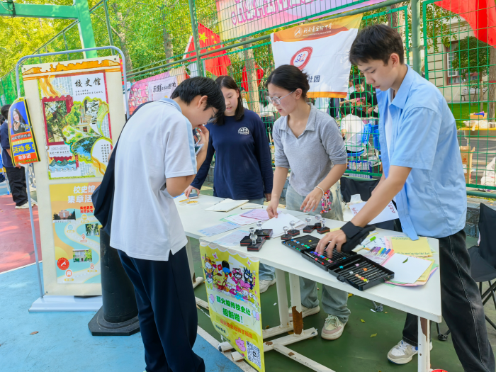 9月29日下午2点,随着铃声响起,篮球场的招新摊位前迅速聚集了大批学生。社团成员们分工明确,有的负责向新生介绍社团日常活动——包括校史馆日常讲解、校史主题研学、老校友访谈、校园文化节策划等;有的则现场演示校史讲解,一段关于“施一公学长的信”的故事,让围拢过来的同学听得入神;还有的引导新生观看海报,耐心解答“如何成为校史讲解员”“加入社团能收获什么”等问题。