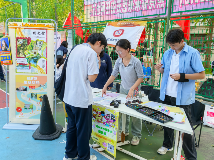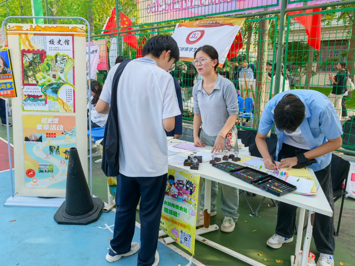社团定制了主题海报,张贴在教学楼、食堂、篮球场等学生密集区域。海报以“薪火”为设计核心元素,校史馆与银杏路交相辉映,既醒目又富有感染力。更具特色的是,社团特别定制了校史馆专属印章——印章上刻有“河南省实验中学校史馆”图样、还有学校logo、校训等,新生只要填写咨询登记表,就能获得社团成员现场加盖的印章,这份独特的“纪念礼”让不少同学直呼“有仪式感”。