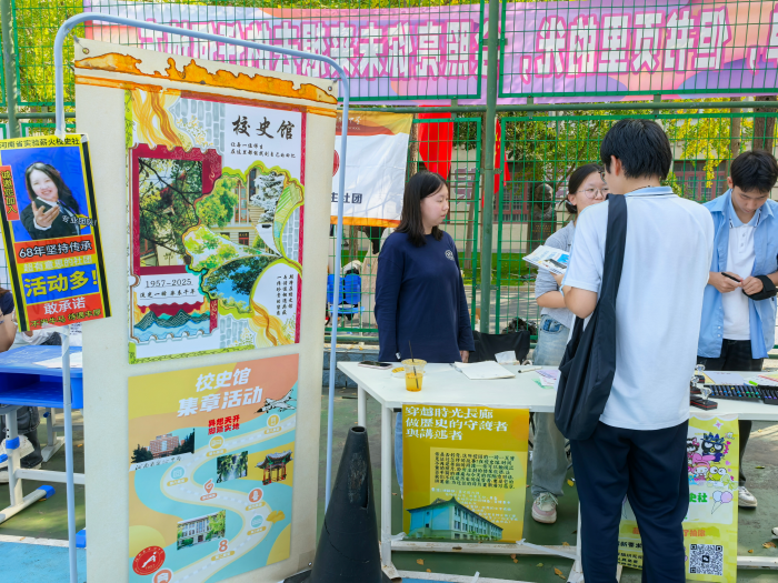 “我们希望通过这些细节,让新生不仅知道‘薪火社’是做什么的,更能感受到校史不是冰冷的文字,而是有温度、有故事的传承。” 社长李同学介绍道,筹备期间,社员们还反复演练校史讲解片段,只为在招新现场能以最生动的方式,让学弟学妹们快速了解社团价值。