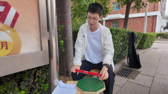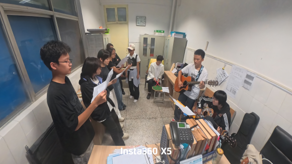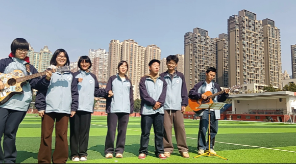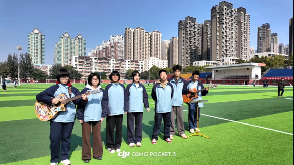 社团成员在操场录制歌曲