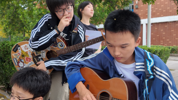 下课了,我们就一起唱几遍;人多了,我们就举着乐器站着合唱。没有什么能难住爱音乐的我们,没有什么能阻挡我们的音乐梦想。正如我们练习的这首歌里所唱:“把浩瀚的海洋装进我胸膛,即使再小的帆也能远航”。