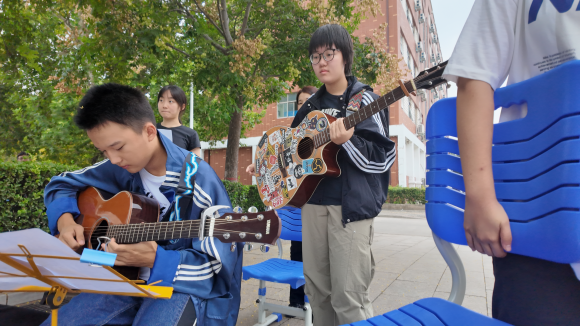 10月22日中午,同学们背着吉他、拿着谱架来到学校操场。在活力满满、动感十足的操场,同学们的兴致瞬间拉满。久违的阳光撒在绿茵场上,背景是同学们踢球、射门的矫健身影,身旁是朋友们驻足关注的好奇目光。阳光暖着麻吉音乐社同学们的笑脸,暖着每一个被真心收藏的音符,暖着我们执着的音乐梦想。