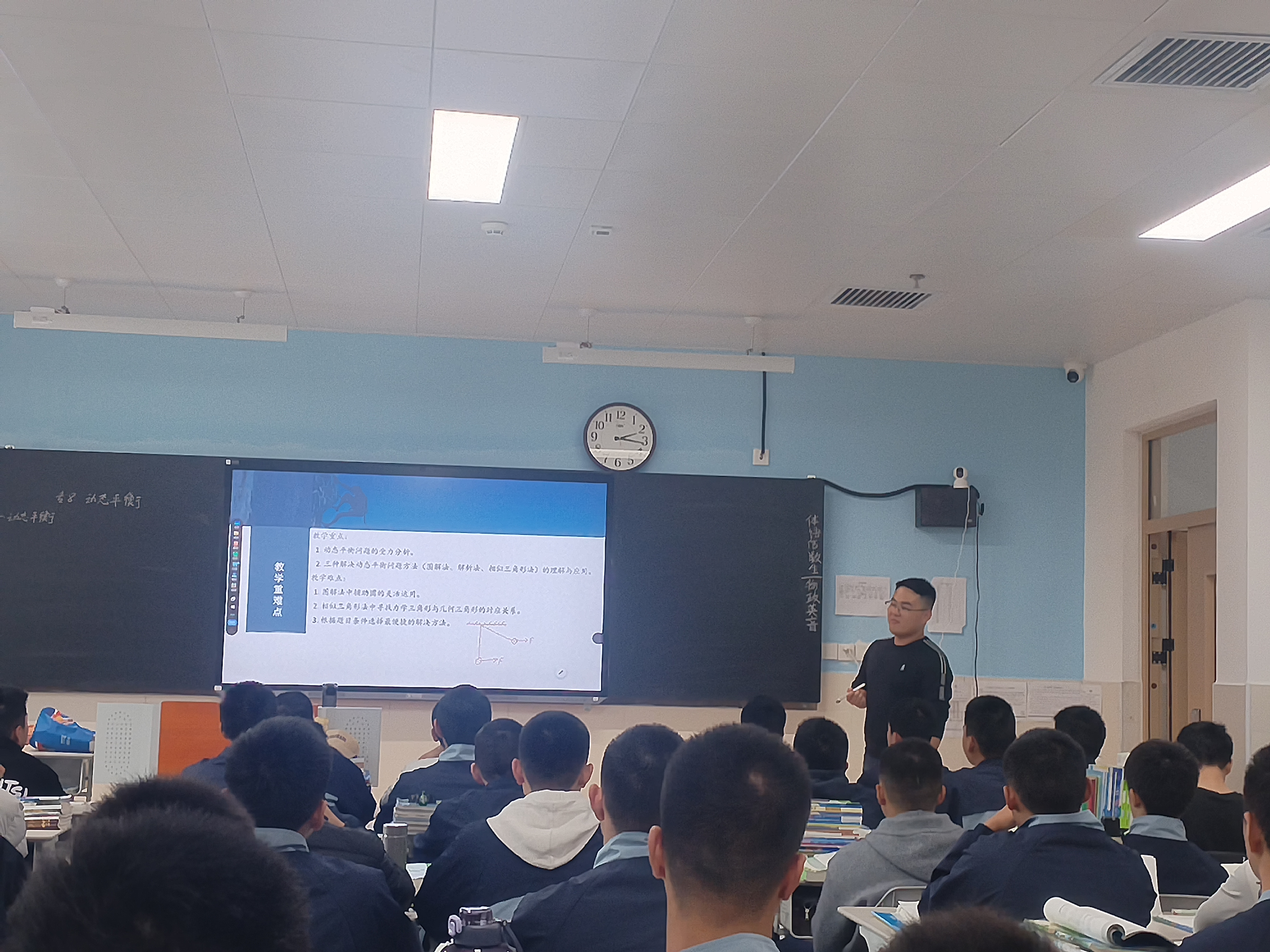 活动中,来自高一物理组的王凡老师,为老师和学生展示了一堂《探究动态平衡问题》的生动课程。面对教学难点,课堂从复习回顾开始,学生们迅速回忆起三个共点力平衡的特点:三个力的合力为零;任意两个力的合力与第三个力等大反向;三个力首尾相连构成矢量三角形。