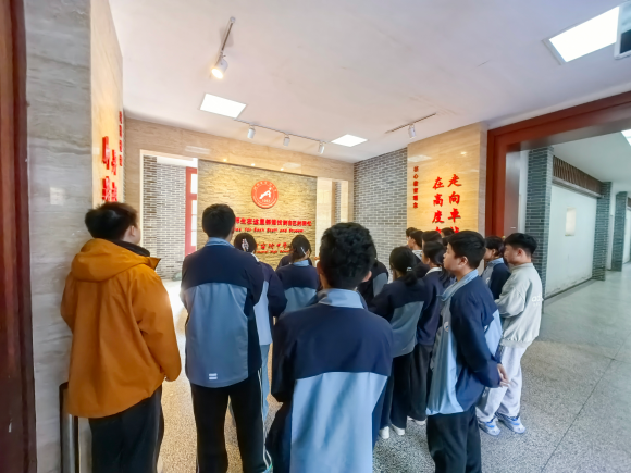 接着,社长与指导老师带领新生们在校史馆文化走廊驻足,生动讲解学校的发展历程、历史典故与精神传承。墙上“高度自觉 走向卓越”的育人理念标语,让新生们直观感受到学校的文化底蕴,激发了他们探寻校史、传播校史的热情。