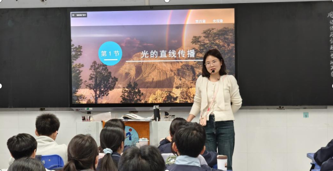 王晓老师主讲内容是八年级物理上册《光的直线传播》。王晓老师以“生活中的光影现象”为切入点,通过播放浏阳烟花秀,清晨林间光斑等短视频,瞬间点燃了学生的学习兴趣。“光是怎么传播到我们的眼睛?”“为什么树荫下的光斑是圆形的?”一连串贴近生活的问题,引导学生从现象出发,主动思考光的传播特点。在新知探究环节,王老师设计了层层递进的实验活动。首先,学生分组进行“探究光在同种均匀介质中的传播路径”实验,利用激光笔、透明玻璃、水、牛奶、等器材,观察光在空气、水、玻璃中的传播轨迹,直观感受到“光沿直线传播”的规律。随后,王老师演示“小孔成像”实验,通过调整烛焰、小孔和光屏的距离,让学生清晰观察到倒立的实像,并用画图法辅助学生理解成像原理。实验过程中,学生分工合作、记录数据、交流讨论,课堂氛围活跃而有序。为巩固知识点,王老师结合生活实际设计了拓展应用环节。通过“射击瞄准”“三点一线”等实例,让学生体会光的直线传播在生活中的应用。