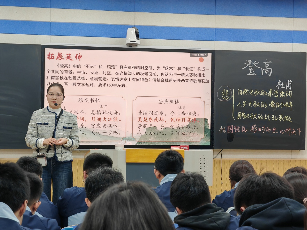 冷老师以知人论世为起点,让学生们在整体诵读和教师范读中初识文本,在深邃浑成的汉语音韵中体悟情感。随后冷老师就各联内容特点提出层层问题。颔联的思考问题——为什么使用“落木”而不是“落叶”,写长江是“来”而不是更常见的“去”,更是将学生引入文本深处。在学生分组讨论环节,冷老师在旁认真聆听,适时点拨答疑。最终师生共同完成对“悲”的内涵理解,对“诗圣”杜甫伟大人格的感知。本节课不止停留在对一篇一文的赏析阅读,还将视野扩展到同作家的不同篇目,以文学短评的方式做到读写结合,加深对杜甫“悲秋”特色的理解和认识。整堂课内容丰富充实,设计精心巧妙,层层深入,充分显示出冷老师的专业素养。