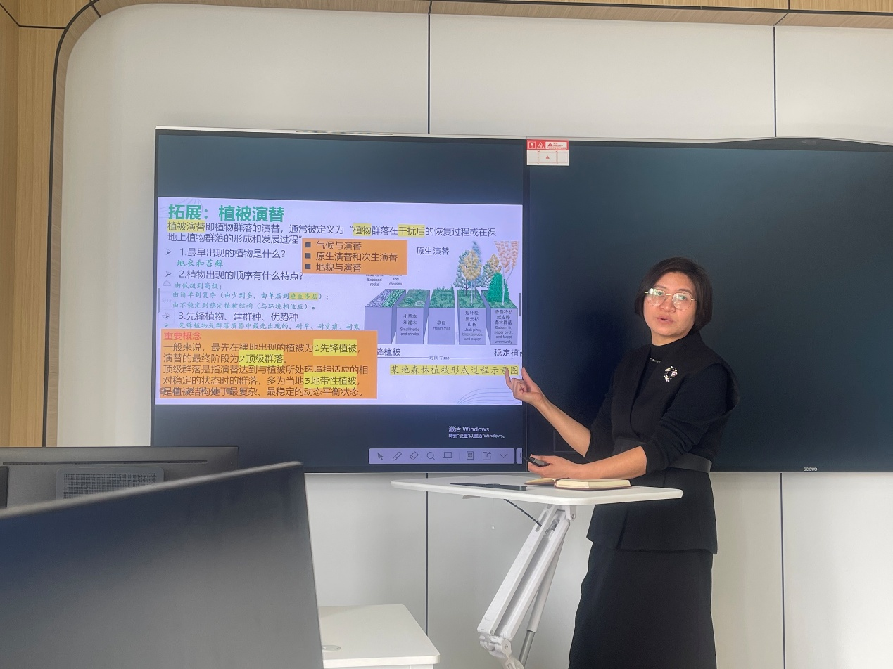 随后,教研组长郭江丽老师围绕 “植被与环境的关系” 进行分享。她紧扣地理课标要求,从一条关于植被的课标出发,系统阐述了植被与气候、土壤、地形等环境要素之间的相互作用。郭老师强调,教师需深研课标,精准把握考点方向,在教学中引导学生建立 “植被 — 环境” 的关联思维,通过典型案例分析,如不同气候区植被类型的差异、植被对水土流失的防治作用等,帮助学生扎实掌握核心知识,提升综合应用能力,从而实现精准备考。