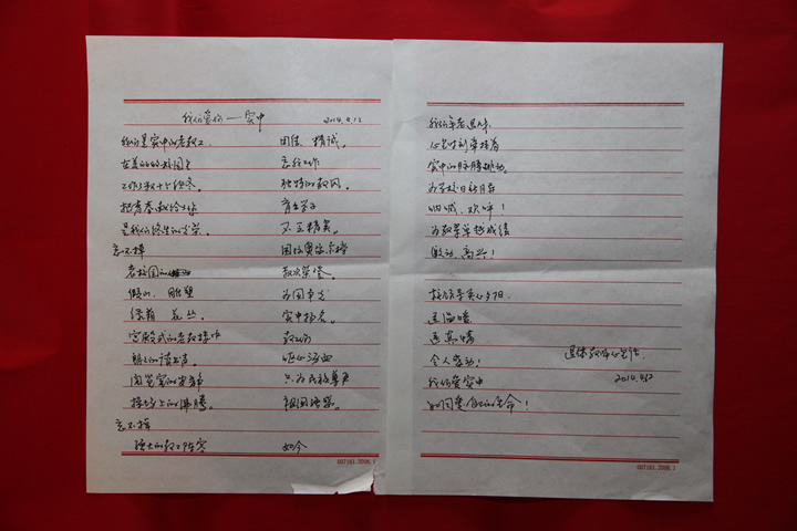 如今\我们年老退休\心里时刻牵挂\实中的脉搏跳动\为学校日新月异\呐喊 欢呼\为教学卓越成绩\激动,高兴!