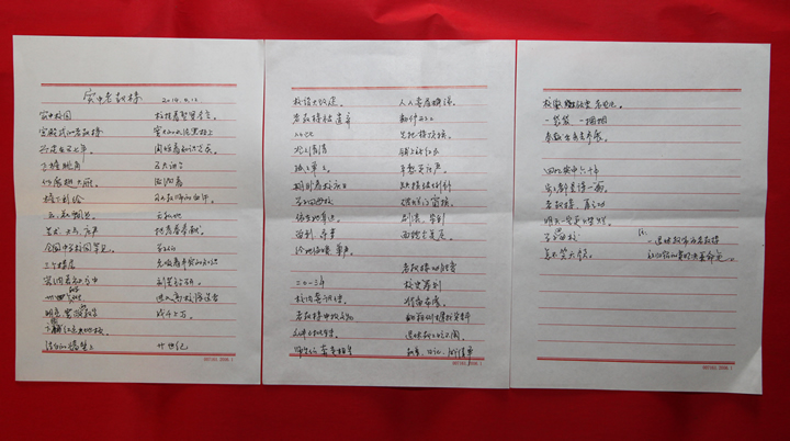 老教楼功能变\校史策划\准备布展\翻箱倒柜找资料\退休教工忙不闲\教案 日记 成绩单\校徽 饭票 老照片\一袋袋 一捆捆\奉献出来去参展\回忆实中六十年\步步都是诗一篇\老教楼 再立功\明天一定更灿烂\学子回母校\怎不笑开颜