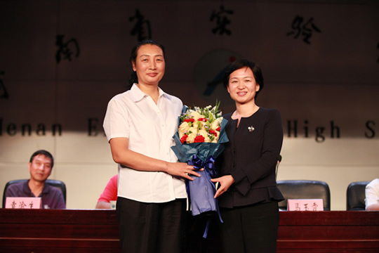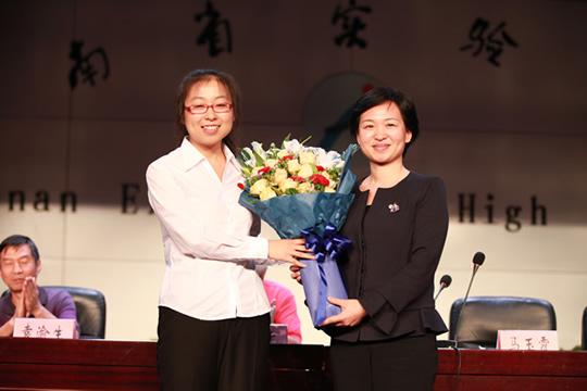 表彰大会上,马玉霞校长还代表学校分别向即将退休的孙小平老师和刚刚踏入工作岗位的新教师代表高萌老师献上鲜花,表达了省实验中学全体同仁向对学校付出几十年心血的老教师们表达诚挚的感谢和深深的敬意,也向新加盟实验大家庭的年轻老师们寄予殷切的期望和美好的祝愿,在全场热烈的掌声中,全体老师都能真切感觉到那种属于实验人的光荣梦想和崇高精神在薪火相传、生生不息!