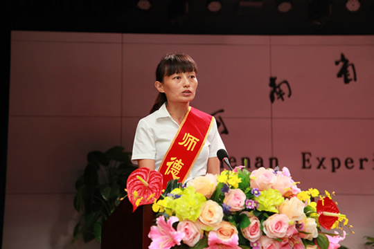 作为一个普普通通的老师,每年的教师节,我都能感到满满的温暖和幸福。今天,站在这里,我感到荣幸也倍感压力,感谢学校和领导对我的肯定和鼓励!但我深知,成绩只属于过去,未来的路将更加漫长,在今后的教育教学工作中,我将和各位同仁一起,努力工作,开心生活,共同创造大实验更加灿烂美好的明天!谢谢大家!