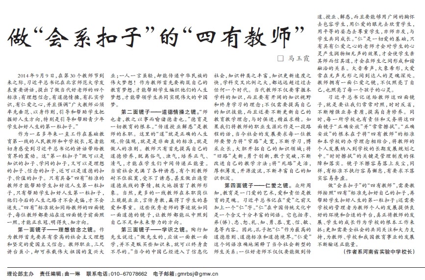 2014年9月9日,在第30个教师节到来之际,习近平总书记在北京师范大学发表重要讲话,提出了做当代好老师的四个标准:有理想信念,有道德情操,有扎实学识,有仁爱之心,并且强调“广大教师必须率先垂范、以身作则,引导和帮助学生把握好人生方向,特别是引导和帮助青少年学生扣好人生的第一粒扣子。”
