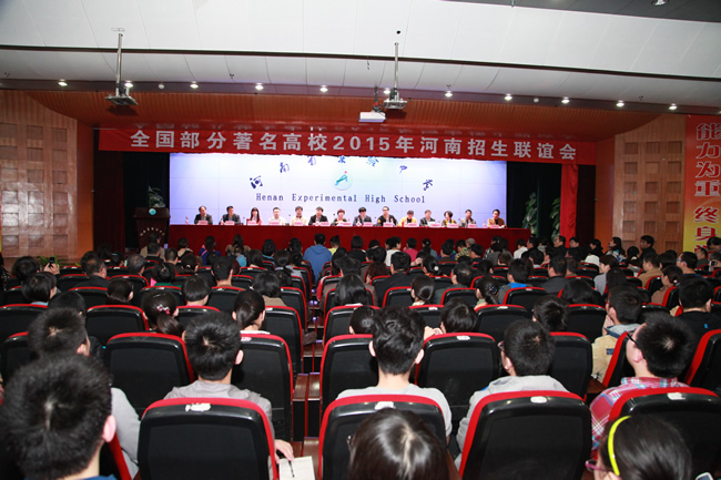 4月19日,全国著名高校2015年河南招生联谊会在我校举行。各高校的招办主任、河南招生组组长为我校学生及家长精彩解读2015年招生政策并进行互动。