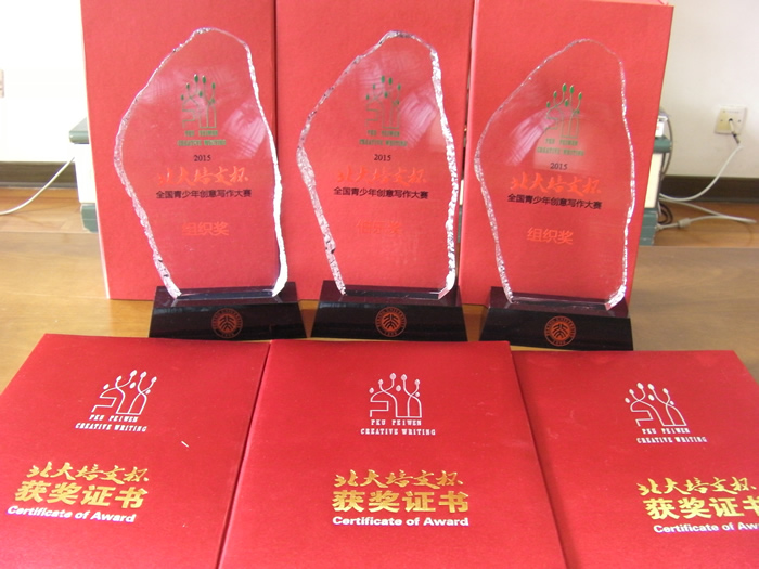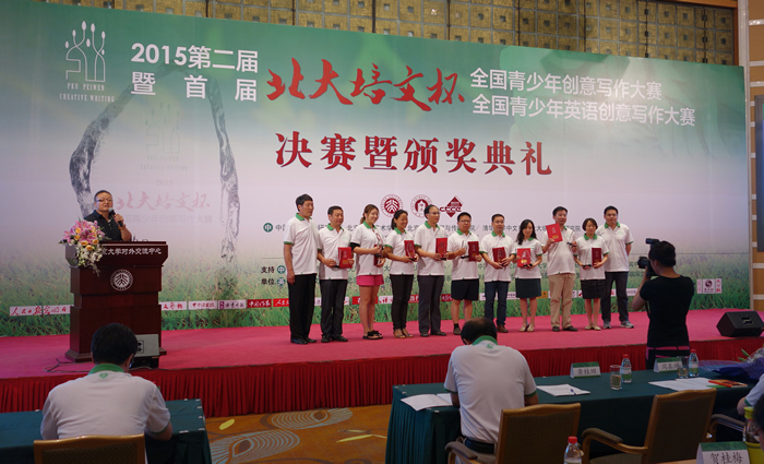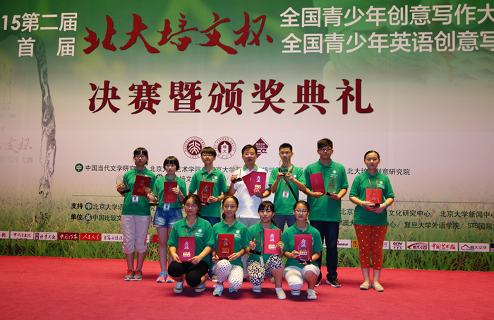2015年7月29日,第二届“北大培文杯”全国青少年创意写作大赛颁奖典礼在北京大学隆重举行。我校师生团队共同发力,荣获多个重要奖项!其中秦家宝同学荣获一等奖,熊泽都﹑潘酩月﹑赵越﹑房文琪﹑张明铭等5位同学荣获二等奖,范桁端﹑李婉慈﹑段佩铉﹑吕琳琳﹑郭陈君﹑董珊佑﹑李佩萱等7位同学荣获三等奖,河南省实验中学和河南省实验文博学校双双荣获组织奖,张定勇老师荣获伯乐奖。我校师生在所有奖项中均斩获颇丰,我校再次成为全国决赛中获奖人数最多的学校!