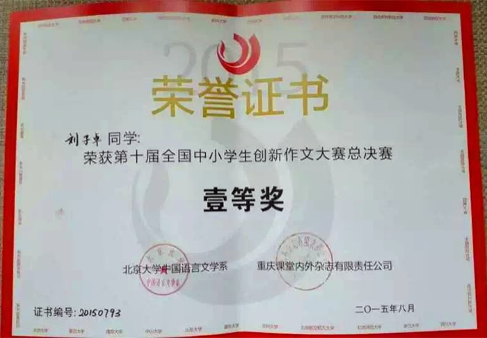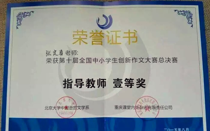 8月1日,由北京大学中文系和重庆课堂内外杂志联合主办的第十届创新作文大赛总决赛在北京大学举行,我校刘子卓同学荣获大赛一等奖,张定勇老师荣获指导教师一等奖!