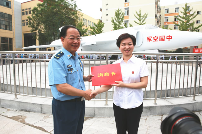 王建起少将向马玉霞校长递交战机捐赠书