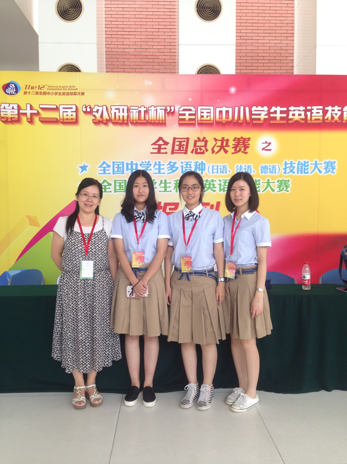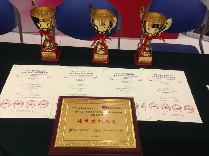 2015年7月22日,由北京外国语大学和全国基础外语教育研究中心联合主办的 “外研社杯”第十二届全国中小学英语知识技能大赛总决赛在北京隆重召开。经过三天的激烈角逐,由李亦涵、燕思祺、刘畅宇三名同学组成的高中团队荣获全国总决赛一等奖,河南省实验中学荣获优秀组织机构奖,刘晶老师荣获全国优秀指导教师奖。