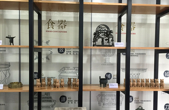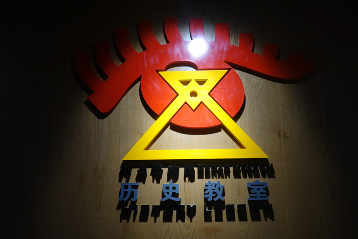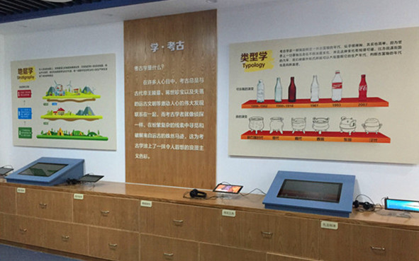 历史教室面积近200平方米,以走廊和教室构成主体,设有教学区、互动区和展示区,并可通过移动展板进行空间分割,适合博物馆主题活动、校园社团活动、班级活动及流动参观的各种需要。走廊设计将历史发展脉络作为主要展示内容,地面以历史年轮和中国历史进行结合展示,让学生对历史的发展和重大事件有了整体认识;墙面悬挂有河南博物院重要文物的图片,并结合38个问题图板,让学生对历史和文物有了新的认识与思考。展示区是该处历史教室的创新和提升,将文明和考古作为主要的解读对象,通过世界版图、文字资料等,对文明形成、文明古国进行了介绍与对比;结合图板、视频及各种文物标本对考古学概念和方法进行了基础说明。历史教室还通过考古资料的整理和模拟考古区的互动设计,让学生了解考古学的严谨与科学。同时,历史教室还充分利用空间进行内容布局,如文物复制品展示、图书阅览,都可以让学生有效获取相关信息。此外,在历史教室的设备及控制方面,除了常规的投影和教学一体机外,还设置了pad、视频播放器对相关内容进行点选或循环播放。室内外的灯光、设备、窗帘开启均采取智能控制,便于教学活动的有序开展。