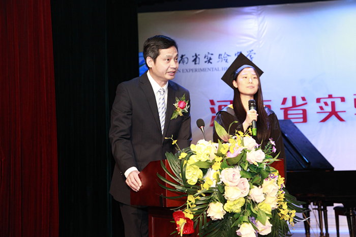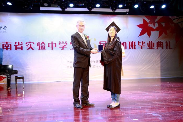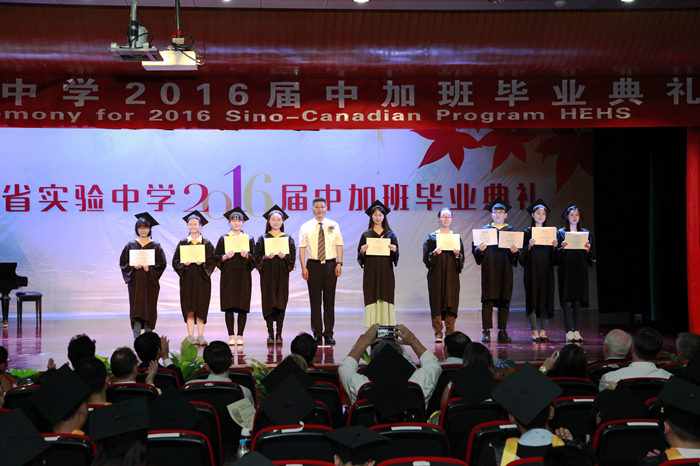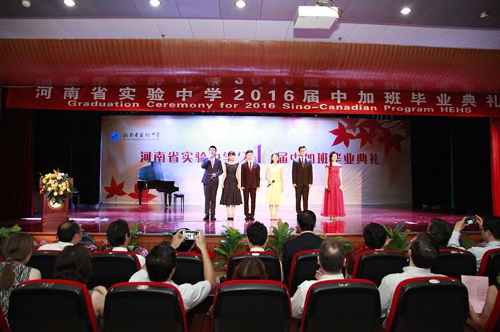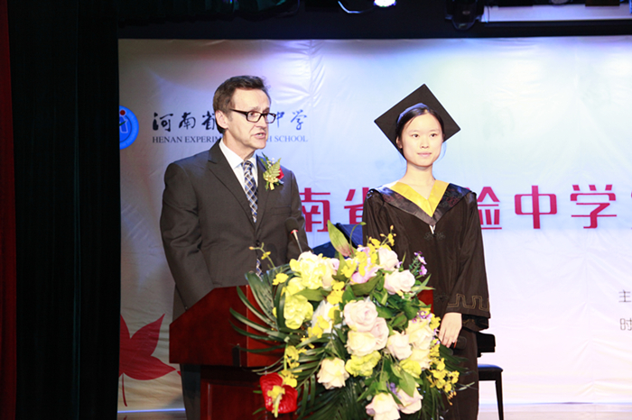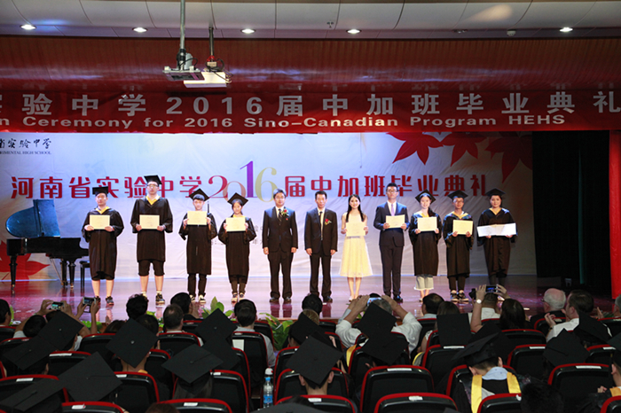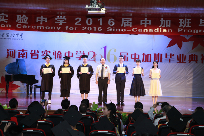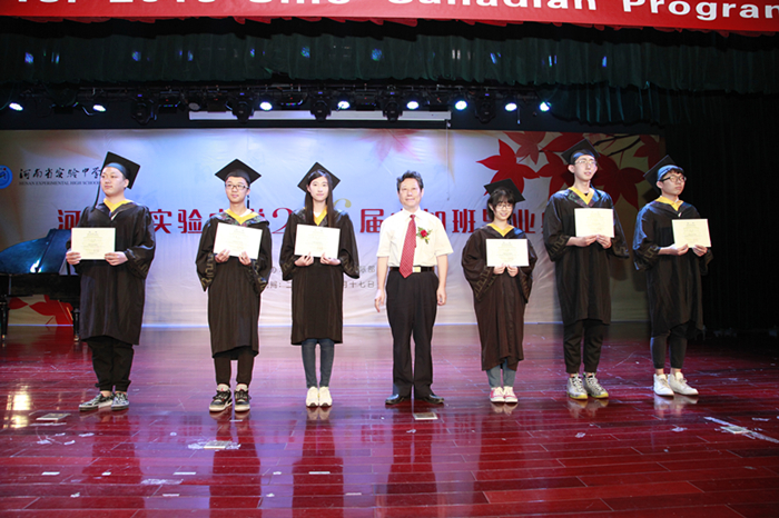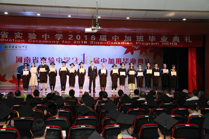 6月17日上午,我校2016届中加班毕业典礼在艺体活动中心三楼报告厅举行。加拿大新斯科舍省教育部区域教育长官 Stephen Amirault 先生、加拿大派特森教育集团总裁Sunny Bai 先生、加拿大新斯科舍省教育部驻河南省实验中学中加项目校长 Bernie Macintyre 先生、加拿大新斯科舍省教育部驻河南省实验中学中加班副校长Ron Sampson。省教育厅国际处副处长陈兆武、我校全体校领导及中加班全体师生、毕业生家长参加了典礼。