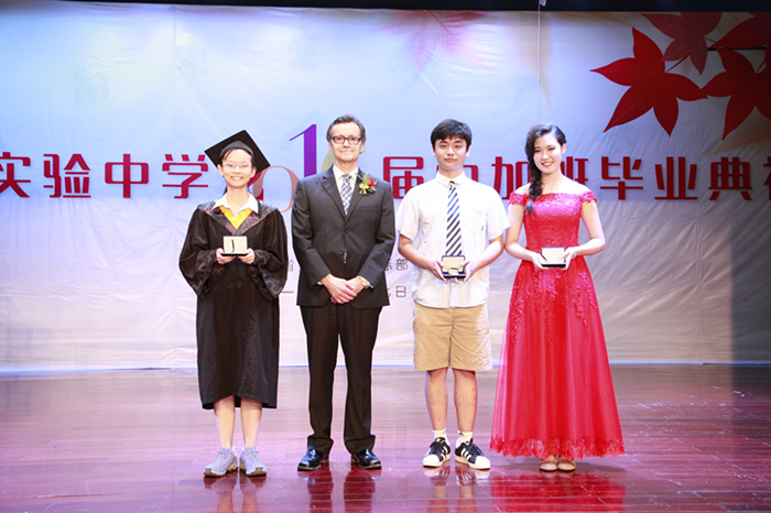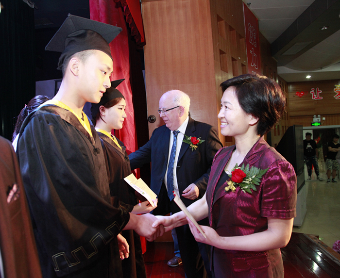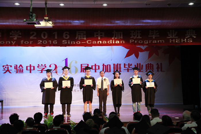 马玉霞校长和加方校长Bernie Macintyre共同为每一位毕业生颁发了中方和加方毕业证书。国际部主任牛炳华宣读了优秀毕业生表彰决定,依次表彰了优秀学生、优秀学生干部、杰出贡献奖、得力助手奖、文明学生奖、单科最高分奖、最大进步奖共75名同学。优秀学生李济辰同学荣获总督奖,邹行远、金正良二位同学荣获州长奖,邢若凡同学荣获伊丽莎白女王奖(此前,邢若凡同学在滑铁卢数学竞赛中获得金牌)。加拿大新斯科舍省教育部区域教育长官 Stephen Amirault 和加拿大派特森教育集团总裁白宁分别为四位同学颁奖。