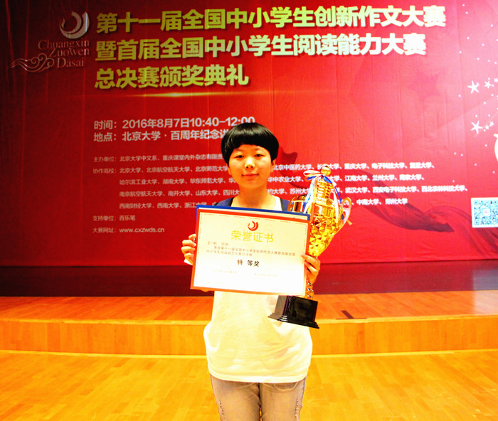 8月7日,第十一届全国中小学生创新作文大赛暨第一届阅读能力大赛全国总决赛颁奖典礼在北京大学百年纪念讲堂隆重举行。我校王一帆同学获特等奖,是河南省选手获得的唯一特等奖,也是河南学生在该项赛事首次获得最高奖。